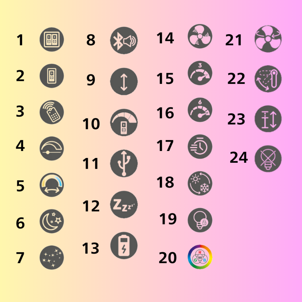 Dnešní stropní ventilátory už nabízejí řadu funkcí – od dálkového ovládání přes RGB osvětlení až po letní a zimní provoz. Výrobci tyto praktické funkce, které vám mohou usnadnit život, označují ikonkami.